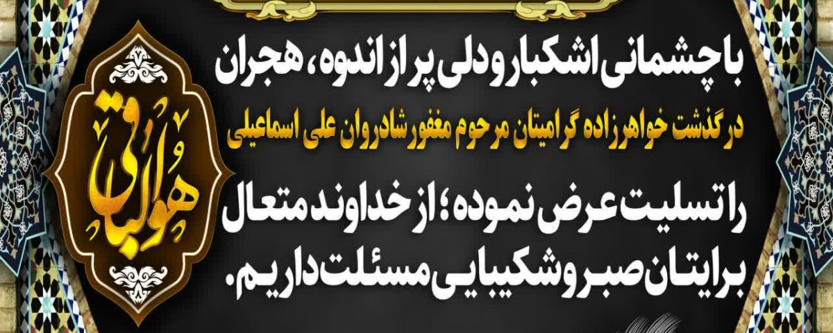 با چشمانی اشکبار و دلی پر از اندوه ، هجران درگذشت خواهرزاده گرامیتان مرحوم مغفورشادروان علی اسماعیلی را تسلیـت عـرض نمـوده ؛ از خداونـد متعال برایتان صبــر و شکیبایــی مسئـلت داریـم.