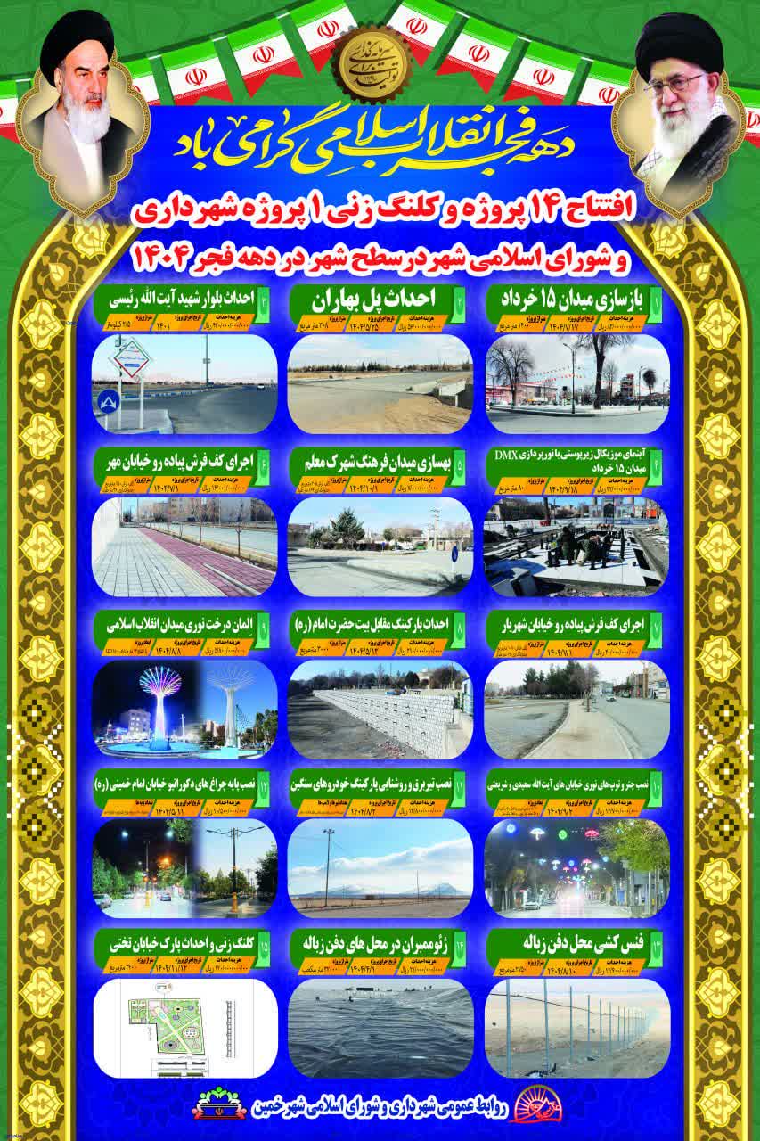 شهرداری و شورای اسلامی شهر خمین در دوازدهم بهمنماه، همزمان با آغاز ایامالله دهه مبارک فجر سال یکهزار و چهارصد و چهار، با اجرای مجموعهای از پروژههای عمرانی و خدماتی، گام مهمی در مسیر توسعه شهری و ارتقای کیفیت زندگی شهروندان برمیدارد. در این روز، چهارده پروژه عمرانی به بهرهبرداری میرسد و یک پروژه جدید نیز کلنگزنی خواهد شد.